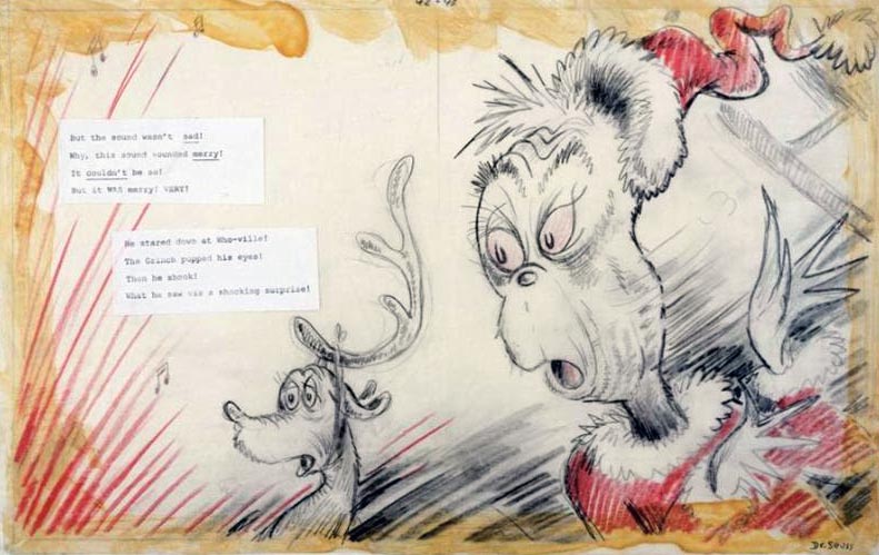 Here is true insight into Dr Seuss’ creative process.  This Sound Sounded Merry is from the original rough drawing used in creating How The Grinch Stole Christmas! and is presented as a collage with the words applied as separate sheets to the drawing, just as in Dr Seuss’ original work.  The largest format ever for an edition of his rough drawings it is of the pivotal moment in Seuss’ transformational work.