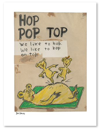 We are pleased to announce the release of Hop Pop Top. The early rough drawing from Hop on Pop is being released as a special Father’s Day work commemorating Dr. Seuss’ relationship with this father. Of Dr. Seuss’s 44 children’s books, he dedicated only 25 of them, typically to those impacting his life at a certain point in time. However, his two dedications to his father, Theodor Robert (T.R.), went far beyond a grateful shout-out. For McElligot’s Pool (1947) Ted wrote: “This book is dedicated to T.R. Geisel of Springfield, Mass., The World’s Greatest Authority on Blackfish, Fiddler Crabs and Deegel Trout.” Ted’s biography clarifies the outlandish sounding creatures: “Deegel trout had been their private joke since a halfhearted fishing trip in his childhood when his father bought outsized trout from the Deegel hatchery and passed them off as their catch.” Nine years later, If I Ran the Circus (1956) carried a full-page tribute, these words appearing in balloons held aloft by a clown: “This book is for my Dad, Big Ted of Springfield, the finest man I’ll ever know.” Then, in 1963, Ted wrote Hop on Pop, a tribute to all of those who shared a similar relationship with their own fathers. Hop Pop Top is being released as a Diptych, see above, and a Single image. The Hop Pop Top Diptych, above, has an image size of 14 X 22.” A fine art pigment print on acid-free paper it has an opening price of $695 unframed, $895 framed. The Hop Pop Top Single has an image size of 14 X 11.” A fine art pigment print on acid-free paper it has an opening price of $395 unframed, $545 framed.. Both works are wonderful additions to your Dr. Seuss collection or as a gift to your favorite “Pop”. For more information on Hop Pop Top please go to http://www.drseussart.com/hoppoptop/dedications.html. To add Hop Pop Top to your collection or as a gift please call, email, or use our secure server at https://www.enetcart.com/gallery.html. To view your favorite Dr. Seuss please visit http://www.jsgalleries.com/artists/seuss.html.