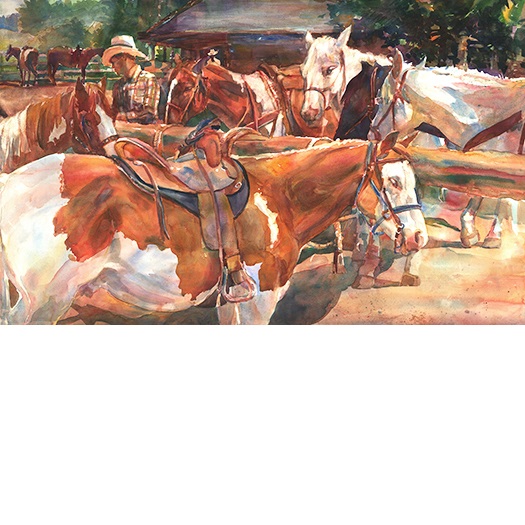 Diederich large watercolor painting of horses getting hitched for a day on the range.