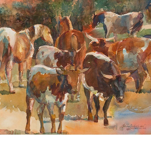 Ellen Jean Diederich Watercolor of Horses and Cattle gathering in the field.