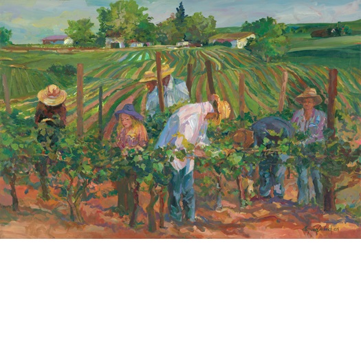 Original Acrylic Painting by Ellen Jean Diederich of vineyard workers tending a field.