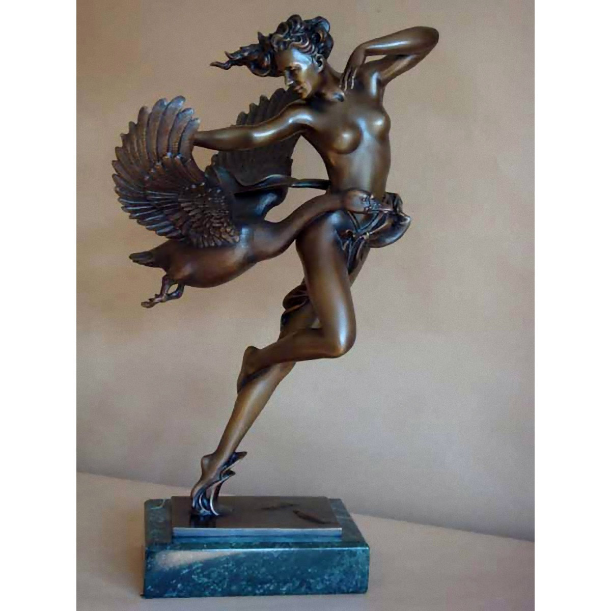 Micheal Parkes’ Night Flight Demi (2010) is a Bronze Sculpture measuring 12 inches D x 10.5 W x 20 inches H; Marble Base: 8.2 inchesD x 5.7 inches W x 3.75 inches H.