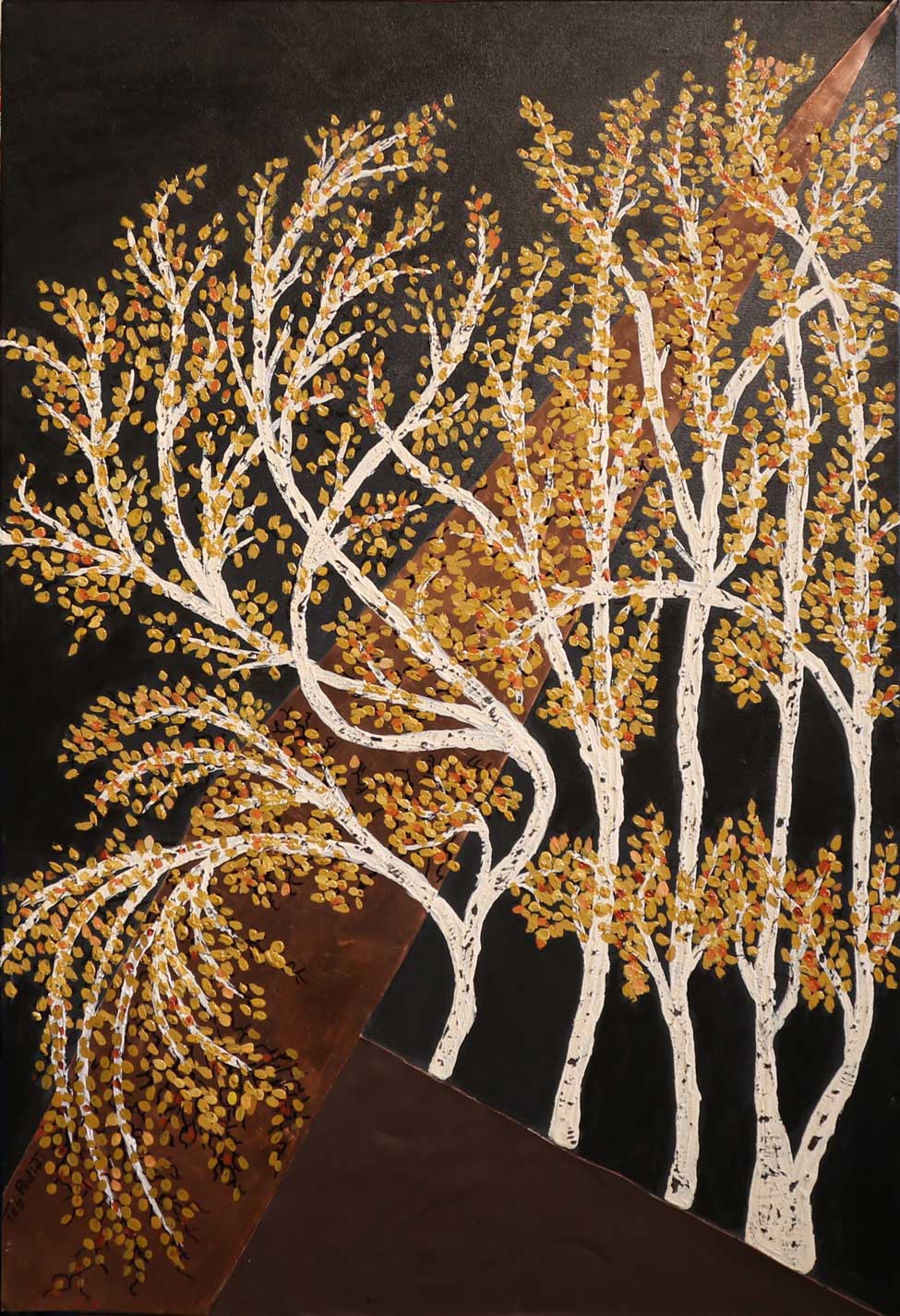 Ted Pouilot’s venture into the world up North. A combination of painting and copper serve to enhance the feel of the Forest in this wonderful acrylic painting brought to you by famous designer Ted Pouilot