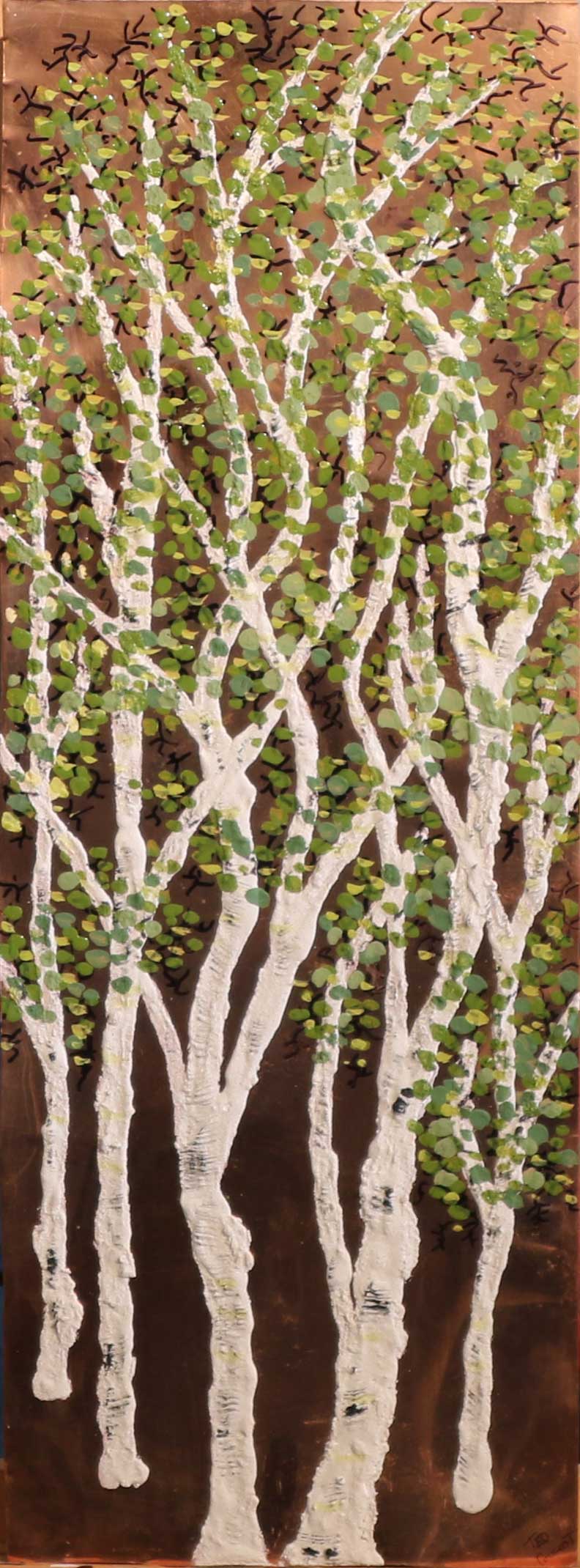 Ted Pouilot’s venture into the world up North. A combination of painting and copper serve to enhance the feel of the Forest in this wonderful acrylic painting brought to you by famous designer Ted Pouilot