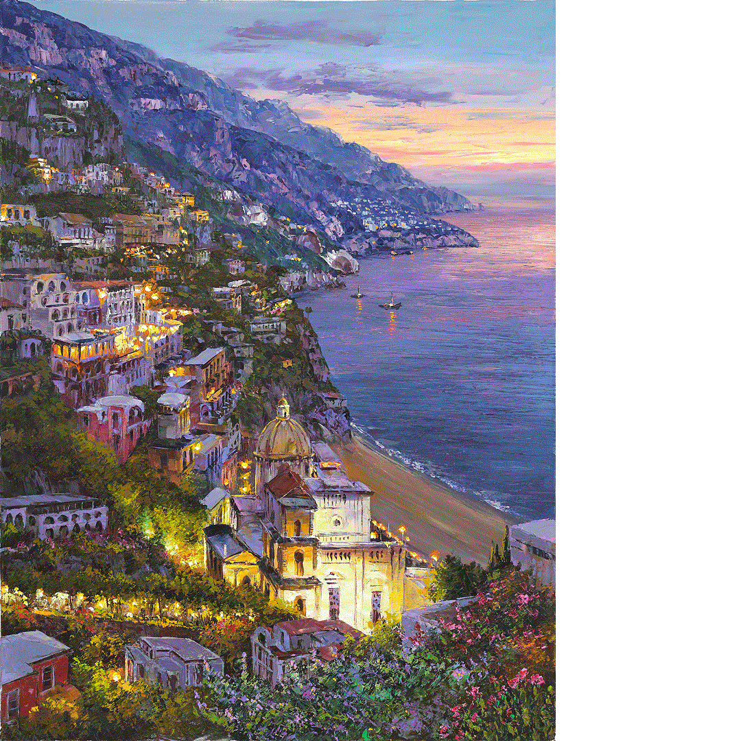 Dramatic painting of the Amalfi Coast town of Positano at dusk painted by impressionist S Sam Park. Wonderful hand-embellished giclee.