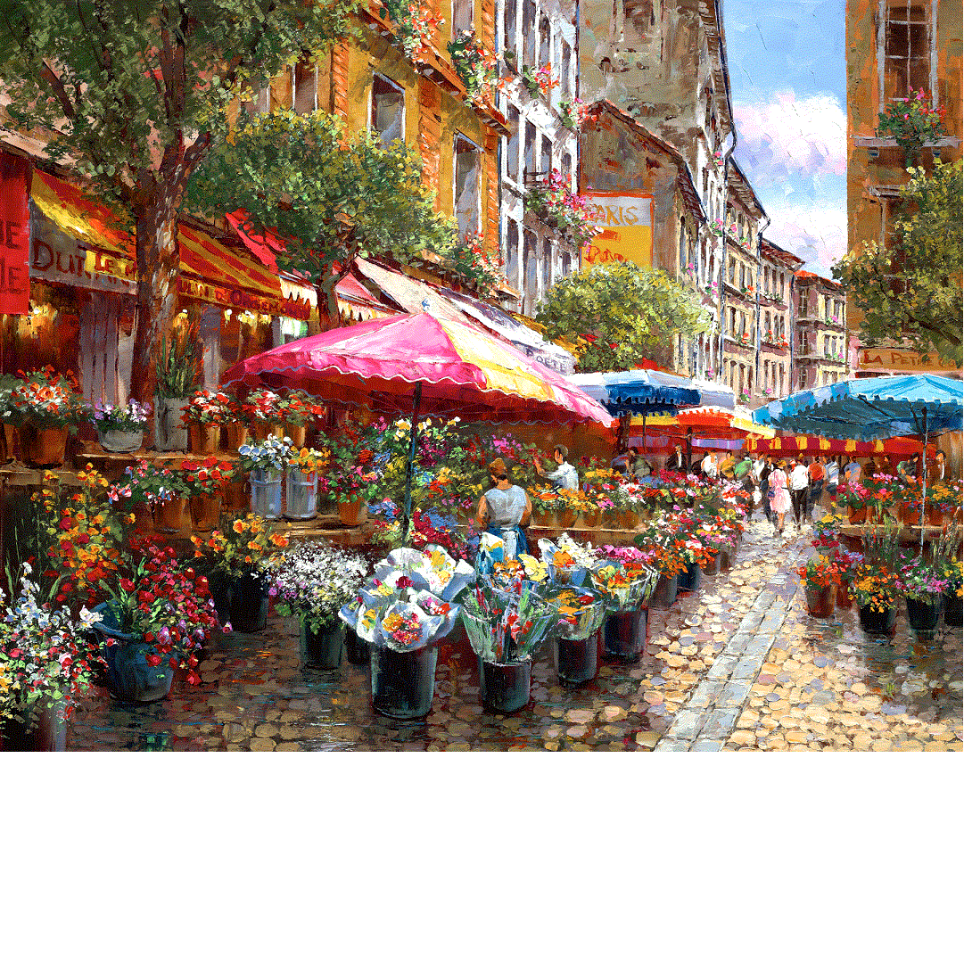 Beautiful Graphic Painting of an Paris street flower market by impressionist S Sam Park. Released as a hand embellished giclee.