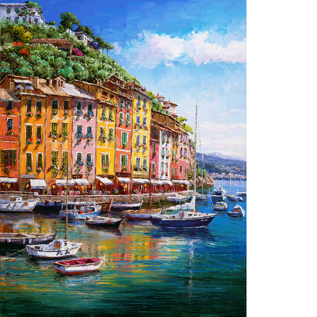 Wonderful hand embellished giclee of Portofino Harbor by noted impressionist S Sam Park