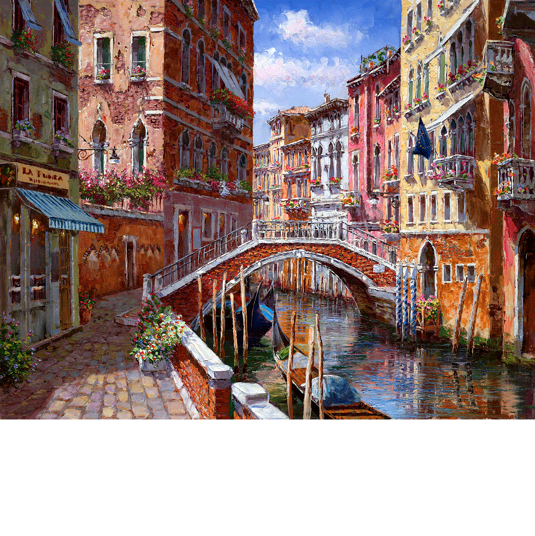 Dramatic painting, hand embellished giclee on canvass, of spring in Venice on the canal created by impressionist S Sam Park.