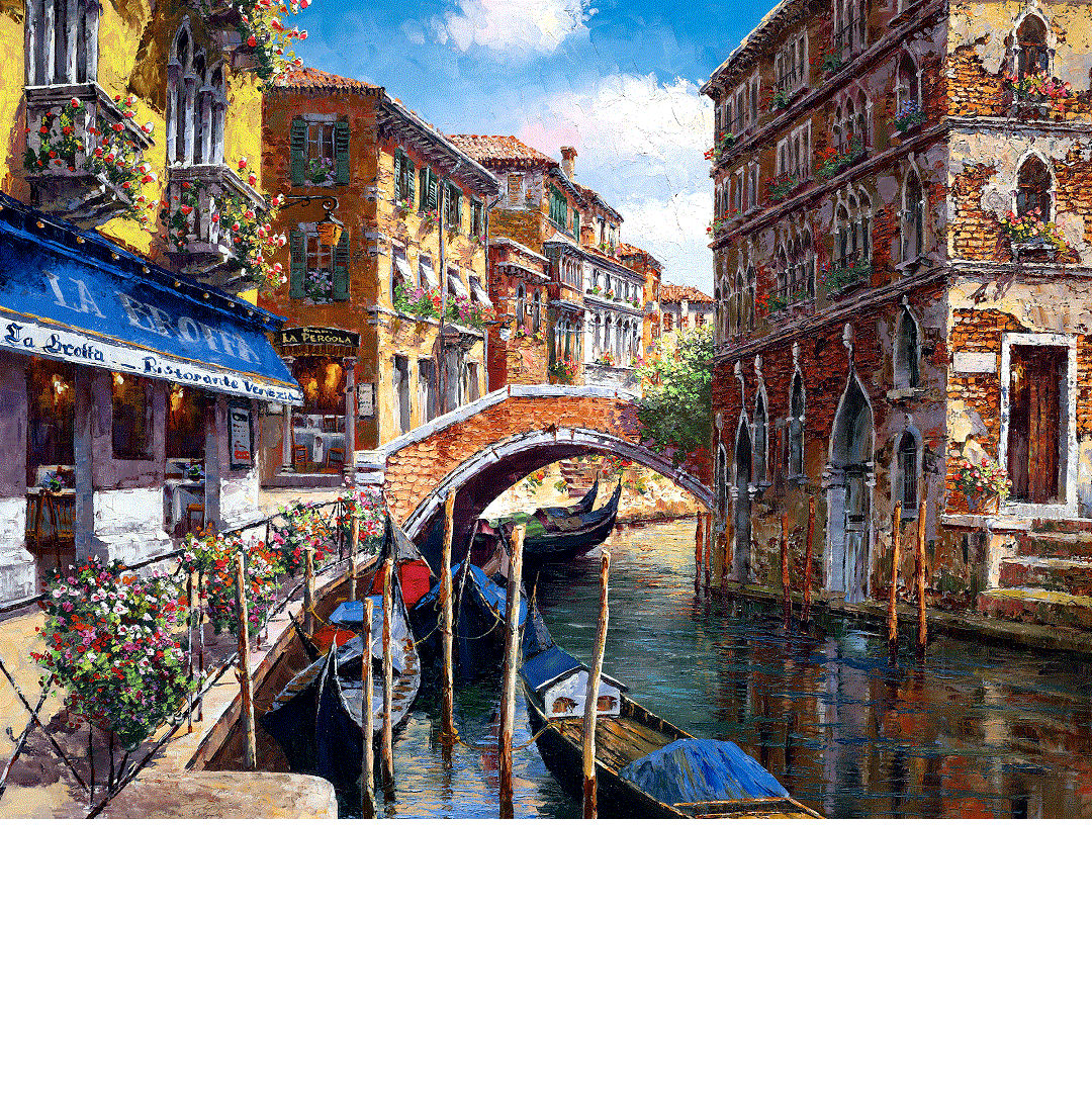 Dramatic painting, hand embellished giclee on canvass, of Venice on the canal created by impressionist S Sam Park.