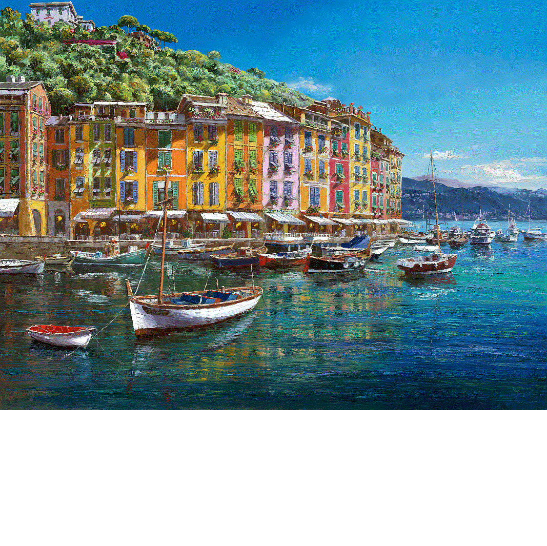 Beautiful view of Portofino Ital as seen from a distance done as a hand embellished graphic on canvas by impressionist S Sam Park
