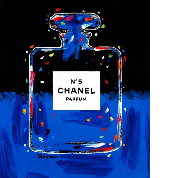 Chanel Bottle in Blue, Acrylic & Ink on Canvas 30 x 26″ Hand Embellished by the Artist