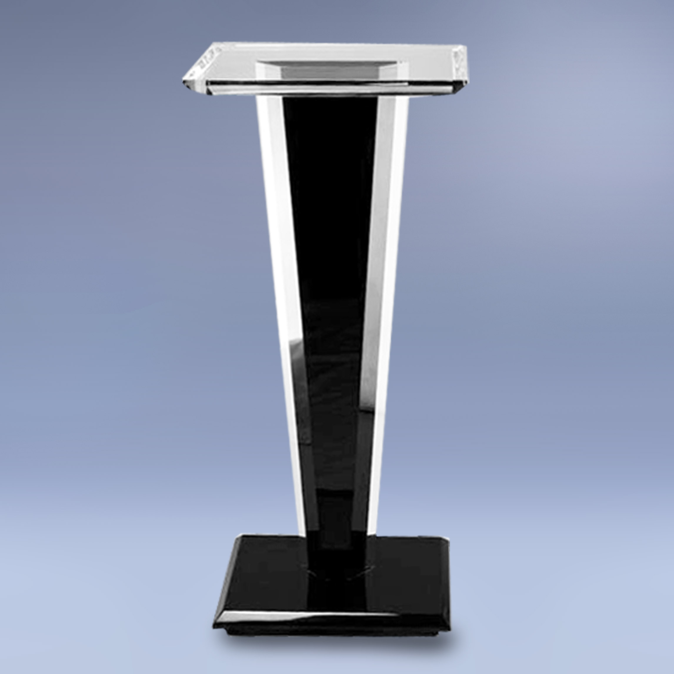 Model 202 is a tapered pedestal in black and translucent acrylics with a 12″ x 16″ display surface. Frosted acrylic available for $150.